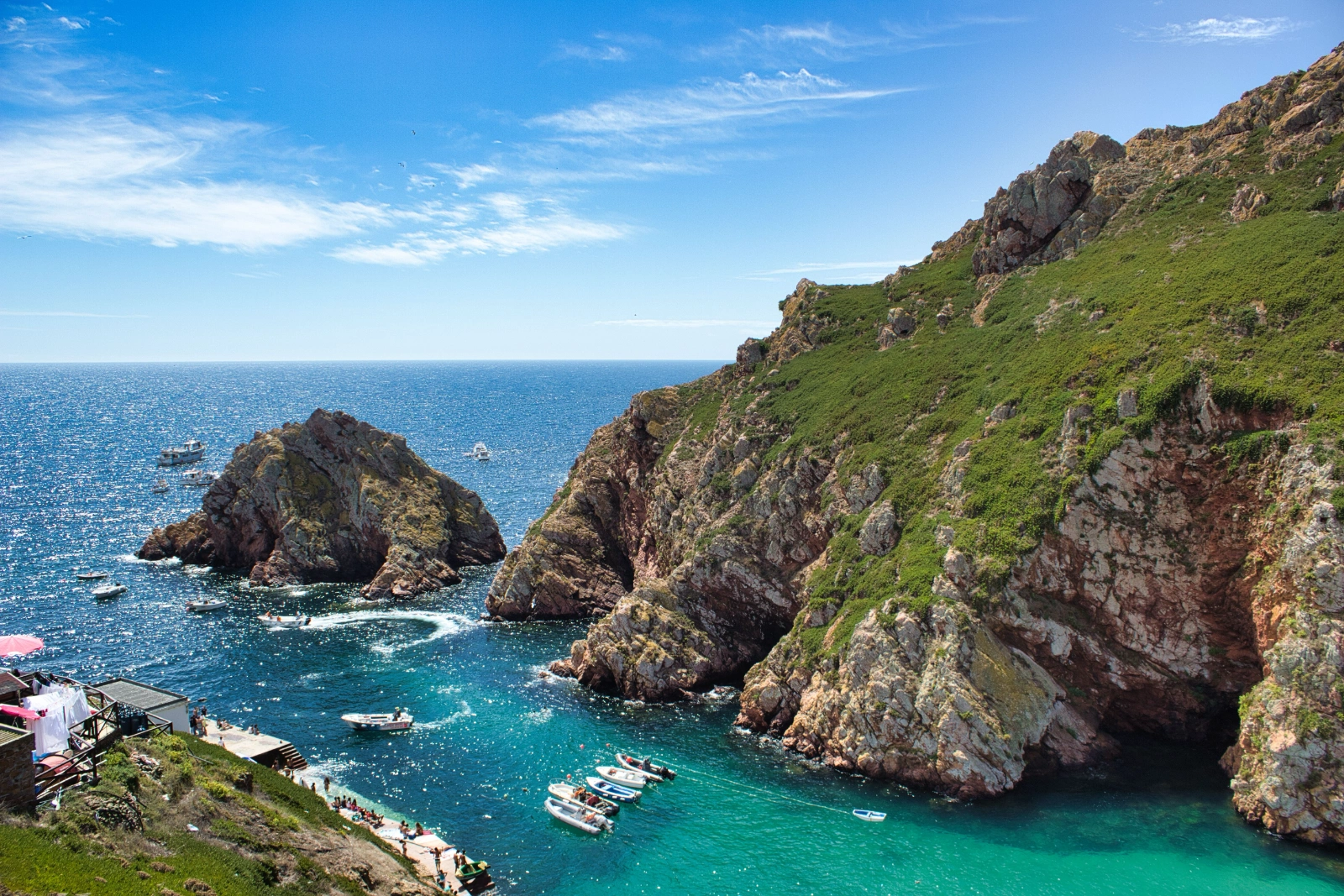 À medida que a embarcação se aproxima da ilha, a beleza natural torna-se evidente: águas cristalinas, cardumes de pequenos peixes visíveis desde o barco, e a icónica praia da Berlenga Grande são apenas o início de um dia repleto de possibilidades.